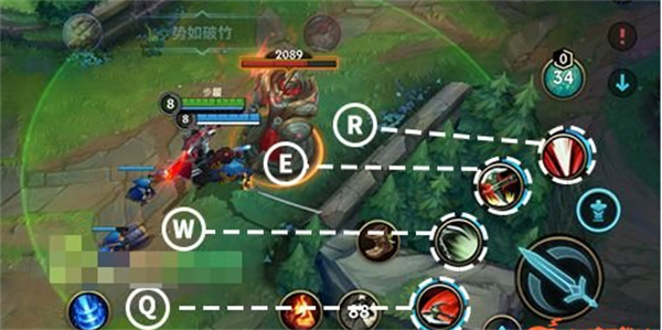 3、小伙伴们可以按照从下往上的顺序去记这个,其实也非常的好记,就是QWER分别对应着一技能、二技能、三技能、大招,并且有的时候也会有非常多的连招玩家们也可以这样去记的哦。