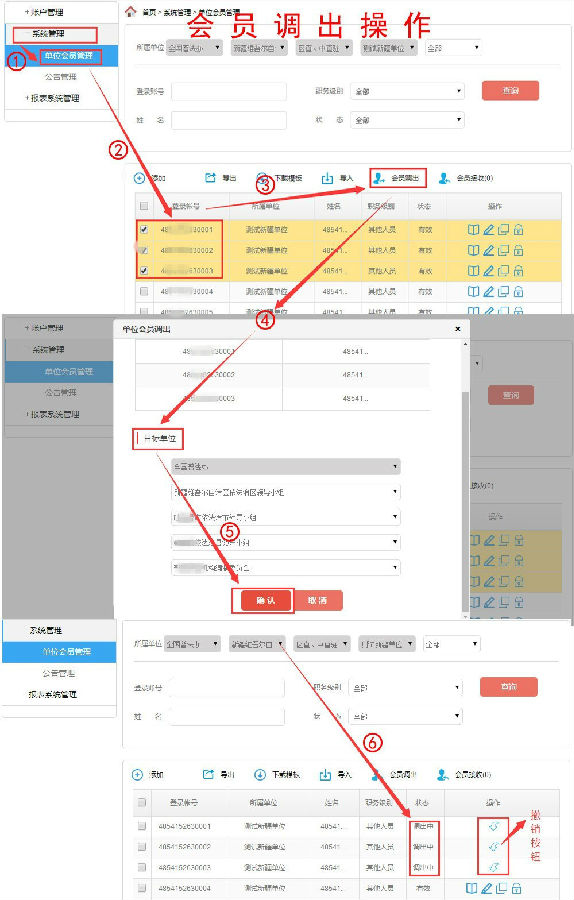 步骤:系统管理→单位会员管理→(选中会员)→会员调出→目标单位→确定→调出成功