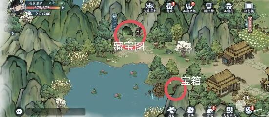 5、藏宝图在中间的山洞,宝箱在左下水车边。